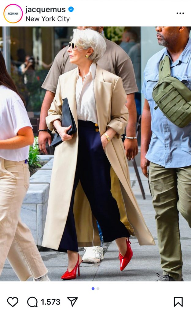 In der Fortsetzung des Modeklassikers Der Teufel trägt Prada 2 trägt Meryl Streep als Miranda Priestly die Jacquemus Slingback-Pumps Cubisto – ein starkes Statement, das Stil und Eleganz vereint. Diese edlen Pumps aus Leder in Burgund sind ein echter Hingucker.